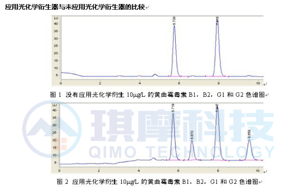 由于黃曲霉毒素 B1和 G1 本來(lái)具有較強(qiáng)的熒光性,但接觸水以后,發(fā)生熒光的淬滅現(xiàn)象,熒光性基本消失,很難用液相色譜檢測(cè)出來(lái),所以我們可以采用衍生的方法使黃曲霉 B1 和 G1 的熒光性增強(qiáng)。目前衍生的方法主要有三氟乙酸衍生法,碘衍生法等。三氟乙酸衍生法,操作步驟繁瑣,試驗(yàn)重復(fù)性很差,而且三氟乙酸毒性很強(qiáng);碘衍生法,需要柱后衍生泵,還要配制碘衍生液,操作也很繁瑣。而本光化學(xué)衍生器不需要任何化學(xué)試劑,直接連接于色譜柱與熒光檢測(cè)器之間,操作簡(jiǎn)單,檢測(cè)結(jié)果準(zhǔn)確,靈敏度高。